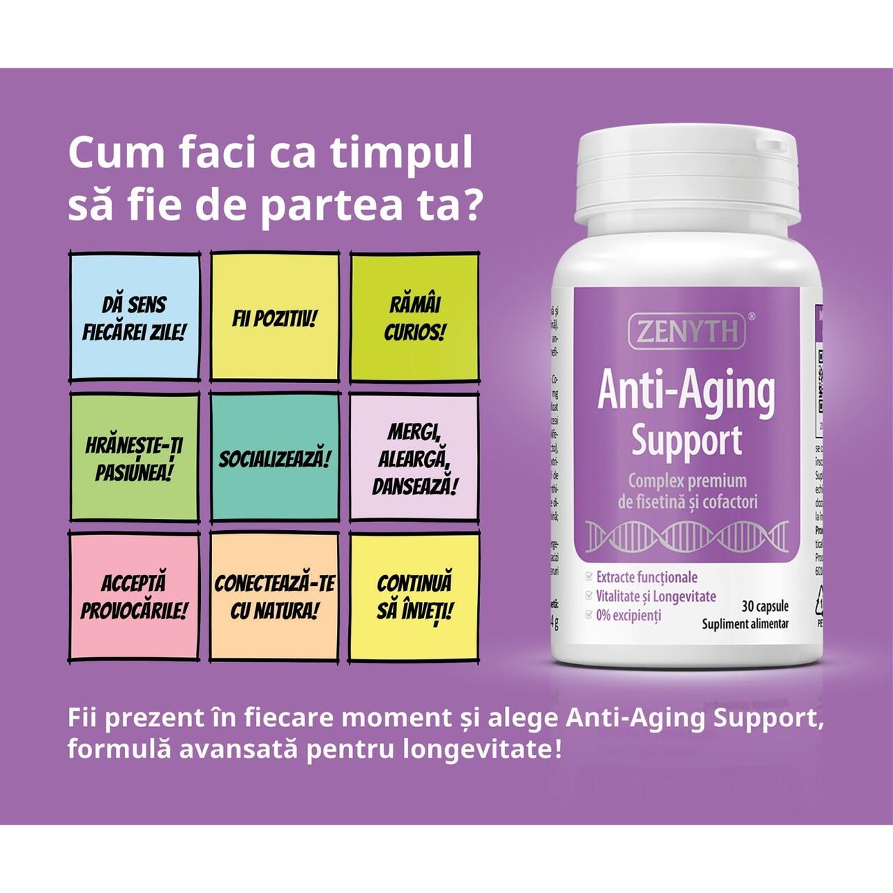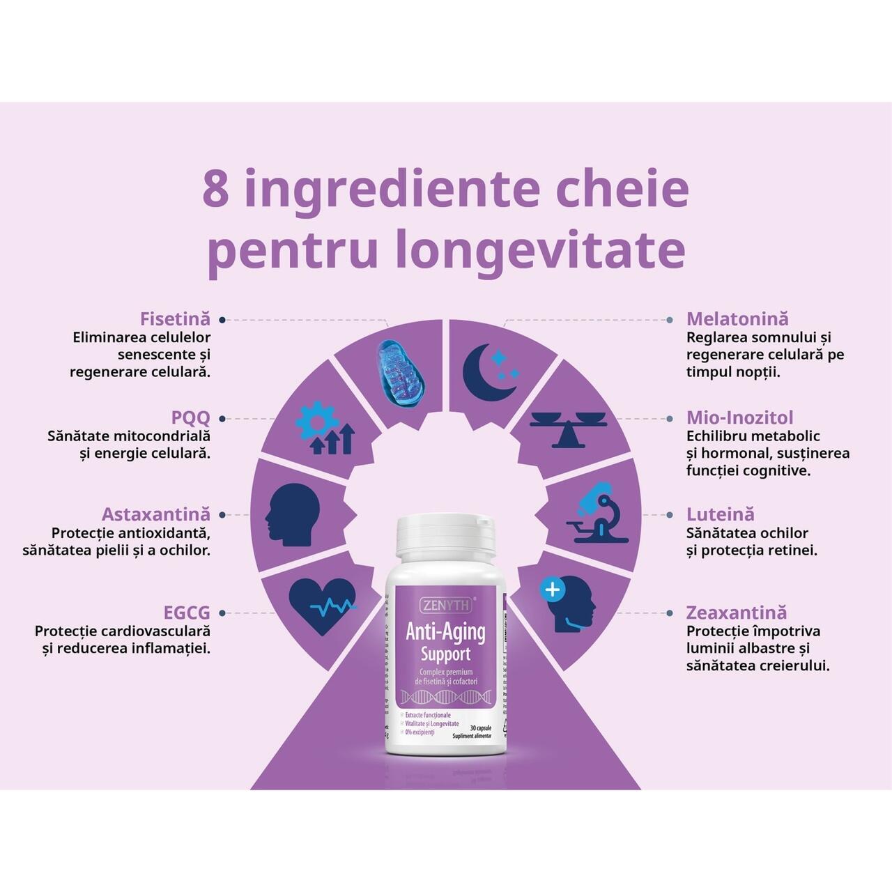 Anti-Aging Support de la Zenyth este un supliment alimentar inovator, conceput pentru a susține longevitatea și regenerarea celulară profundă, printr-o formulă premium bazată pe cele mai recente cercetări științifice din domeniul anti-aging.