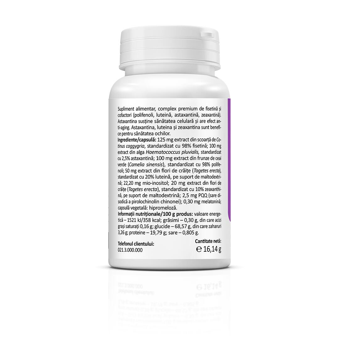 Formulă complexă cu fisetină, PQQ, astaxantină, melatonină, mio-inozitol, EGCG, luteină și zeaxantină.