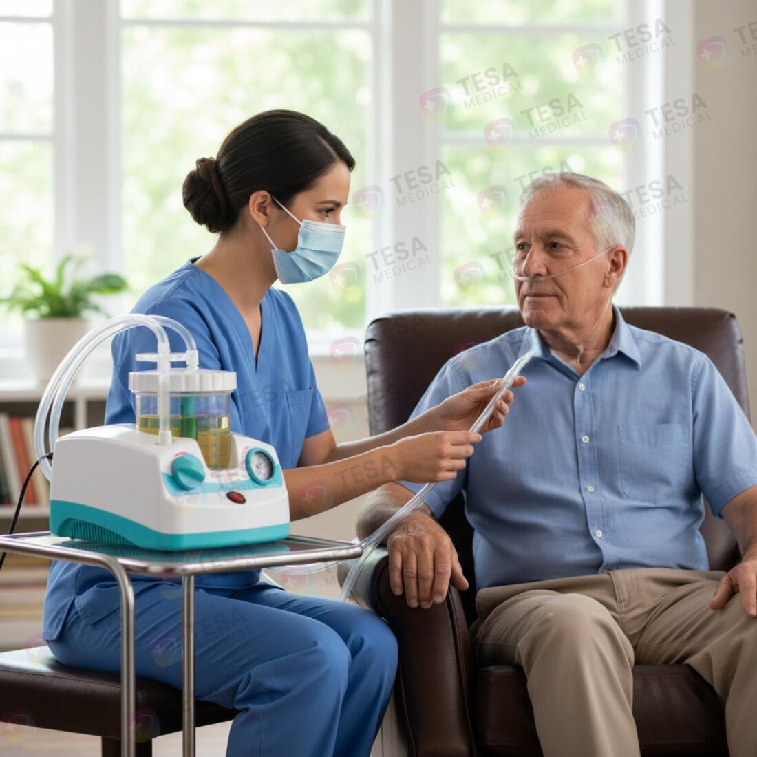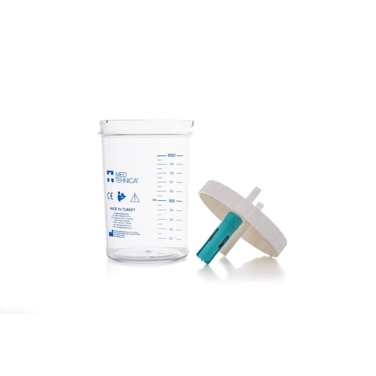 - Dispozitivul are un recipient de colectare a lichidelor din policarbonat autoclavabil, capac din plastic cu sistem de flotare pentru prevenirea scurgerilor si manometru negativ