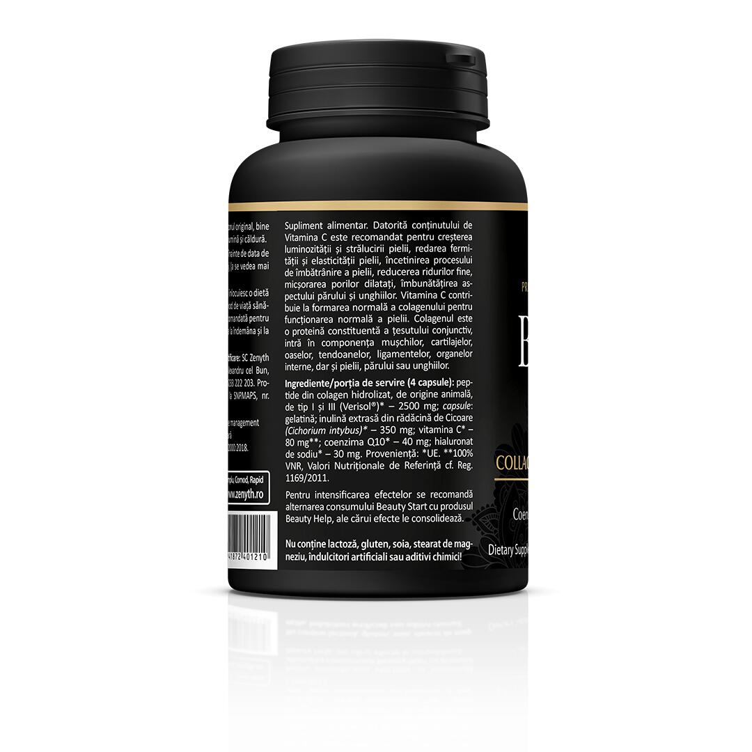 Este posibil să te bucuri de o piele frumoasă și sănătoasă indiferent de vârstă? Da, dar trebuie să începi îngrijirea din interior. Beauty Start este un supliment alimentar nutricosmetic pentru îngrijirea pielii, părului și unghiilor din interior. Produsul poate fi folosit fie de către tineri și adulți pentru prevenirea problemelor la nivelul pielii, fie ca produs de întreținere și consolidare a efectelor obținute după consumul Beauty Help. Astfel, după o cură de 2-3 luni de Beauty Help, se poate face o cură 2-3 luni pentru consolidarea rezultatelor cu ajutorul Beauty Start. Beauty Start este un supliment alimentar pe bază de colagen, vitamina C, coenzima Q10 și acid hialuronic, care ajută la prevenirea semnelor specifice îmbătrânirii.