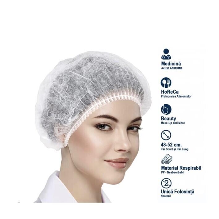 Elasticul perimetral asigură fixare sigură, iar diametrul de 48 cm permite acoperirea eficientă a părului, inclusiv în cazul părului lung sau voluminos. Produsul este de unică folosință și ambalat la set de 100 bucăți.