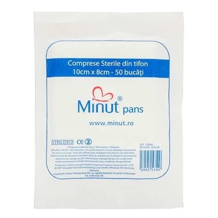 Compresele sterile tăiate din tifon Minut sunt pentru îngrijirea plăgilor și pentru pansamente de zi cu zi, acasă sau în mediul medical. Sunt din bumbac 100%, absorb bine și ajută la protejarea zonei acoperite, atunci când sunt folosite corect.