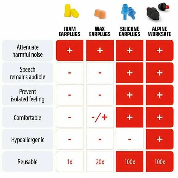 Filtrele acustice speciale din dopurile pentru urechi WorkSafe oferă o atenuare suplimentară a zgomotului, blocând tot zgomotul dăunător generat de utilaje. Zgomotul este redus la un nivel sigur, care poate fi tolerat timp de opt ore. Datorită filtrelor AlpineAcousticFilters sofisticate, puteți continua să comunicați cu colegii de muncă. Sunetele de alarmă rămân, de asemenea, audibile.