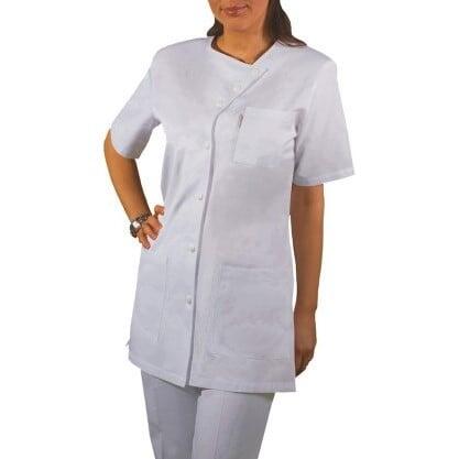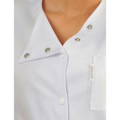 Designul cu anchior asimetric, care descheiat formează un decolteu comod în formă de V, și lungimea medie oferă libertate de mișcare și un aspect profesional modern. Capsele albe nickel free, șlițurile laterale și întăriturile cu termocolant sporesc rezistența și funcționalitatea halatului.