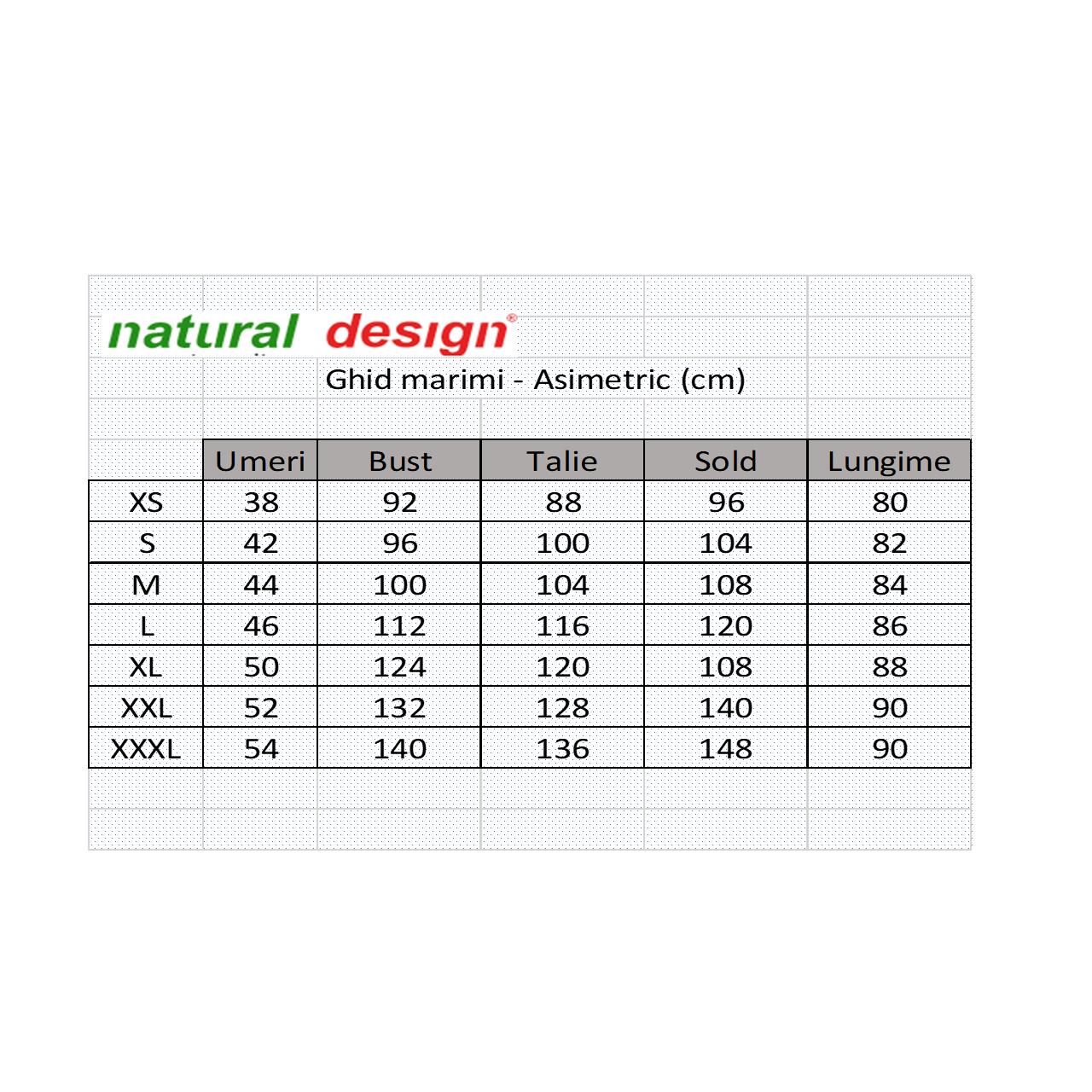 Ce croială are? – Croială modernă, cu anchior asimetric și lungime medie.