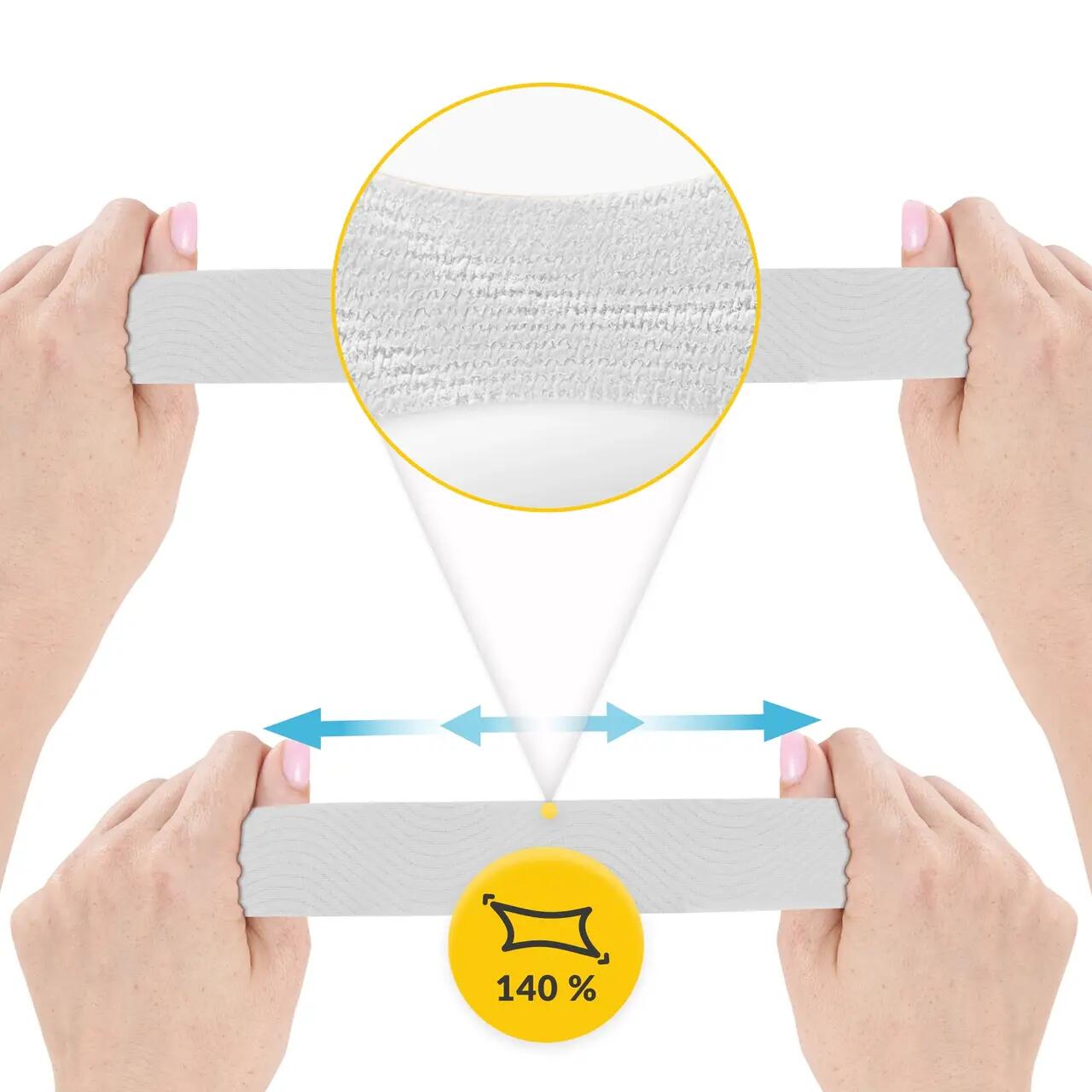 Materialul elastic și respirabil din bumbac permite o aderență sigură pe piele, fără a provoca iritații, fiind ideală pentru sportivi, kinetoterapeuți și persoane aflate în proces de recuperare medicală.