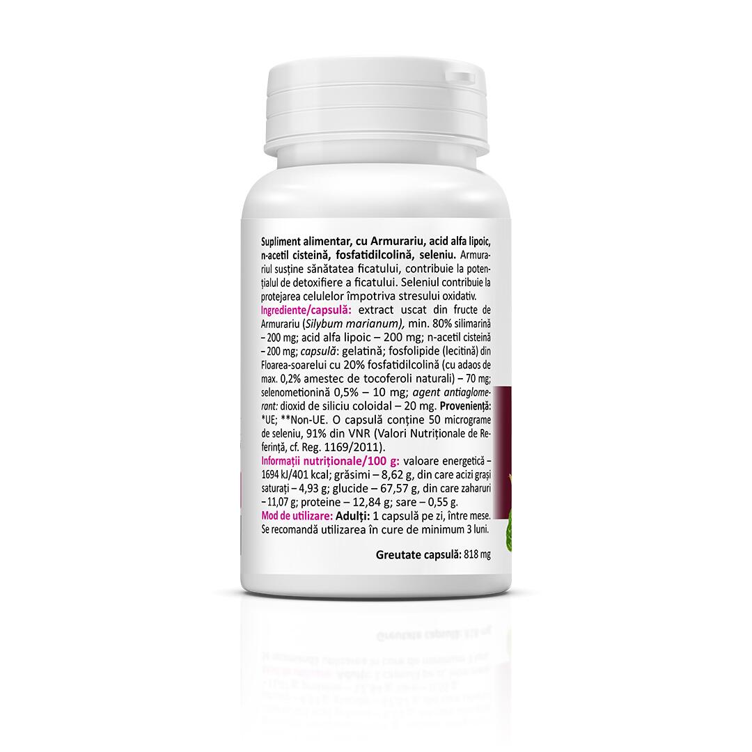 În completarea acțiunii armurariului vine acidul alfa lipoic, un ingredient cu acțiune antioxidantă pronunțată. Spre deosebire de alți antioxidanți, care sunt solubili doar în apă (Vitamina C) sau doar în grăsimi (Vitamina E), acidul alfa lipoic este solubil deopotrivă în apă și în grăsimi, această proprietate explicând extraordinara capacitate de neutralizare a radicalilor liberi a acidului alfa lipoic. Acidul alfa lipoic contribuie la formarea glutationului, cel mai puternic antioxidant endogen din corpul uman. În plus, acidul alfa lipoic reduce nivelul produselor de descompunere metabolică induse de etanol și, prin urmare, poate fi un tratament eficient pentru hepatita indusă de alcool și ciroza timpurie. Studiile au arătat că acidul alfa lipoic în asociere cu silimarina și seleniul poate constitui un tratament util în hepatita C. Cele trei substanțe protejează ficatul de radicalii liberi, cresc nivelul altor antioxidanți și interferează cu proliferarea virală.
