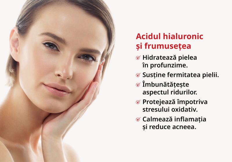 Fiind un element indispensabil, acidul hialuronic îndeplinește mai multe funcții în corpul uman. Stimulează producția de colagen. Colagenul este o proteină din piele necesară pentru menținerea fermității și elasticității pielii. Odată cu trecerea anilor, nivelul colagenului se diminuează, ceea ce poate duce la apariția primelor semne de îmbătrânire și a ridurilor. Acidul hialuronic stimulează producția de colagen și elastină, dovedind reale proprietăți antiaging. Hidratează în profunzime. Datorită capacității sale de a atrage și de a reține o cantitate mare de apă în țesuturi, acidul hialuronic este considerat unul dintre cei mai buni umectanți ai pielii. Este folosit în foarte multe produse de îngrijire a pielii încă de la începuturile industriei cosmetice, iar administrarea lui internă este o metodă și mai eficientă pentru a te bucura de o piele hidratată și cu aspect proaspăt. Lubrifiază cartilajele și articulațiile. Așa cum am menționat anterior, acidul hialuronic are capacitatea de a forma legături cu apa. În plus, este prezent în lichidul sinovial al articulațiilor, ceea ce asigură lubrifierea lor optimă. De asemenea, acesta acționează ca un amortizor, o perniță de protecție în interiorul articulației, reducând fricțiunea oaselor în timpul mișcării. Un aport suficient de acid hialuronic poate preveni degradarea articulațiilor și cartilajelor și poate preveni o serie de afecțiuni, printre care osteoartrita. Cicatrizarea mai rapidă a leziunilor. Fiind unul dintre componentele principale ale matricei extracelulare, acidul hialuronic este considerat unul dintre elementele de bază în procesul de regenerare a țesuturilor. Studiile au demonstrat că, în prezența unei leziuni la nivel cutanat, producția naturală de acid hialuronic din corp crește. Prin urmare, aportul de acid hialuronic accelerează procesul de cicatrizare a rănilor, calmează inflamația și grăbește procesul de regenerare celulară, astfel încât țesutul afectat să fie înlocuit cât mai rapid cu unul nou și sănătos.