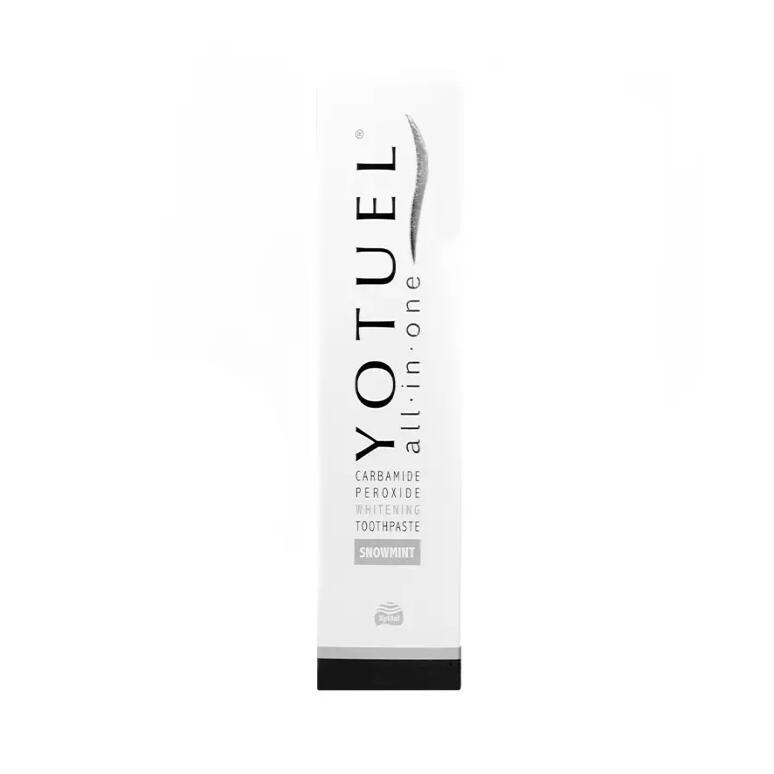 Yotuel all.in.one Snowmint ajuta la protejarea smaltului de eroziunile acide. Formula sa completa bogata in xilitol (un ingredient natural obtinut din arborele de mesteacan), Fluor, Calciu si fosfati reduce impactul eroziv cauzat de bauturile izotonice, bauturile acidulate si sucurile de fructe. Este produsul de albire folosit de medicii stomatologi.E ste prima pasta de dinti pentru albirea dintilor care imbunatateste rezistenta smaltului dintilor. Contine formula patentata YOTUEL cu peroxid de carbamida, care albeste dintii in profunzime, remineralizeaza smaltul si lupta impotriva cariilor dentare.