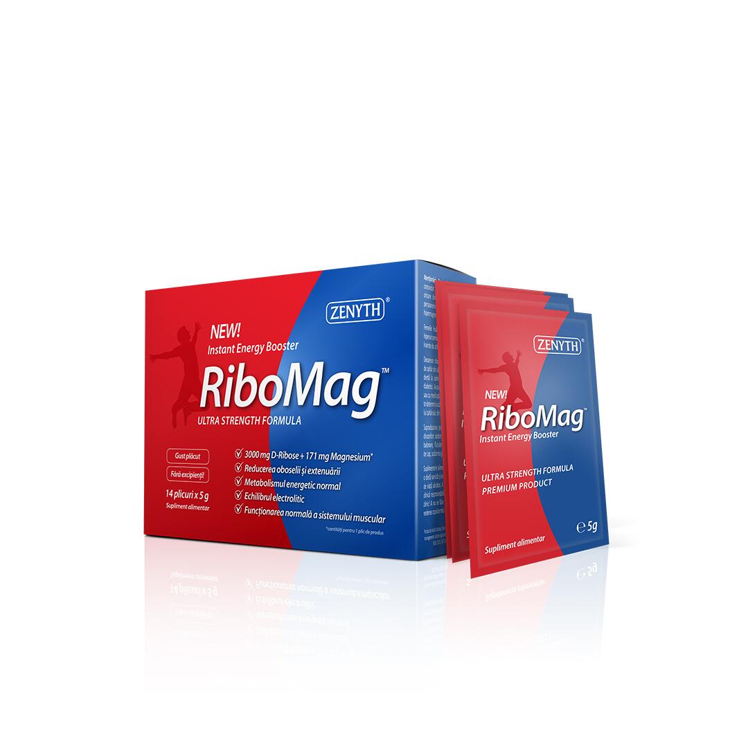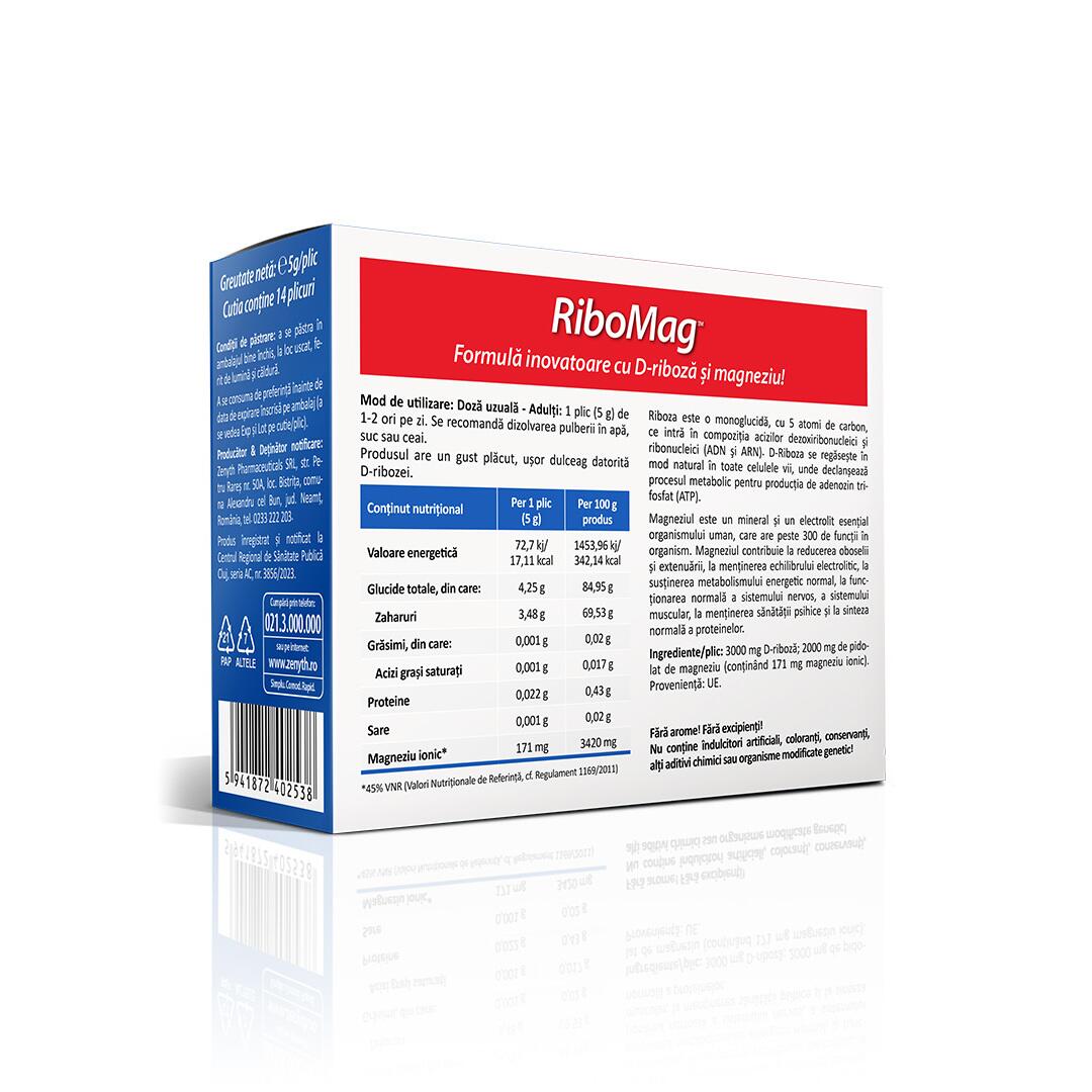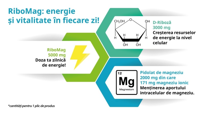 RiboMag este un supliment alimentar care combină beneficiile d-ribozei și magneziului pidolat, pentru a reduce oboseala și extenuarea, pentru a menține echilibrul electrolitic și pentru a susține metabolismul energetic normal.