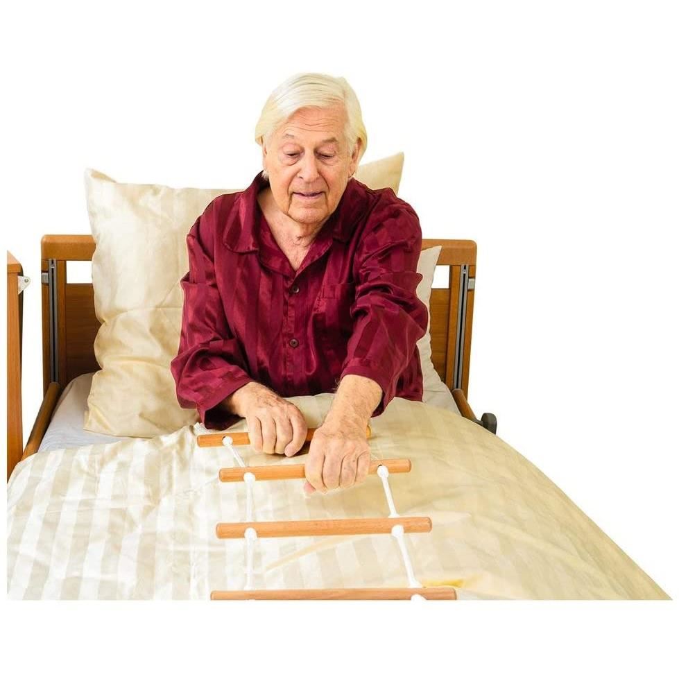 Scara de pat se fixeaza la capataiul de la picioare. Cu ajutorul celor sase fustei prinsi de franghiile scarii, persoana care are nevoie de ajutor se poate ridica sau culca in pat fara asistenta.