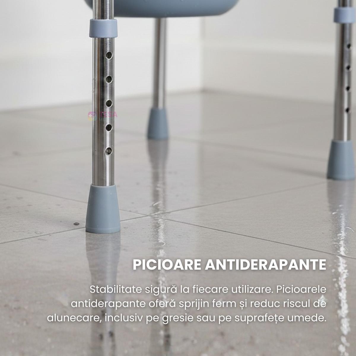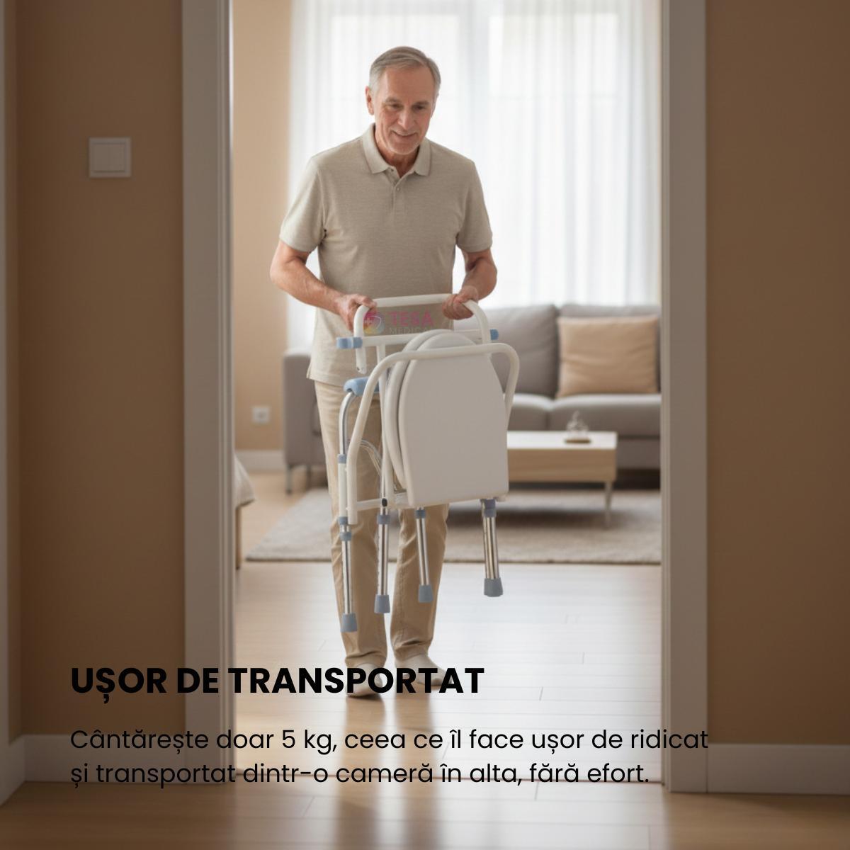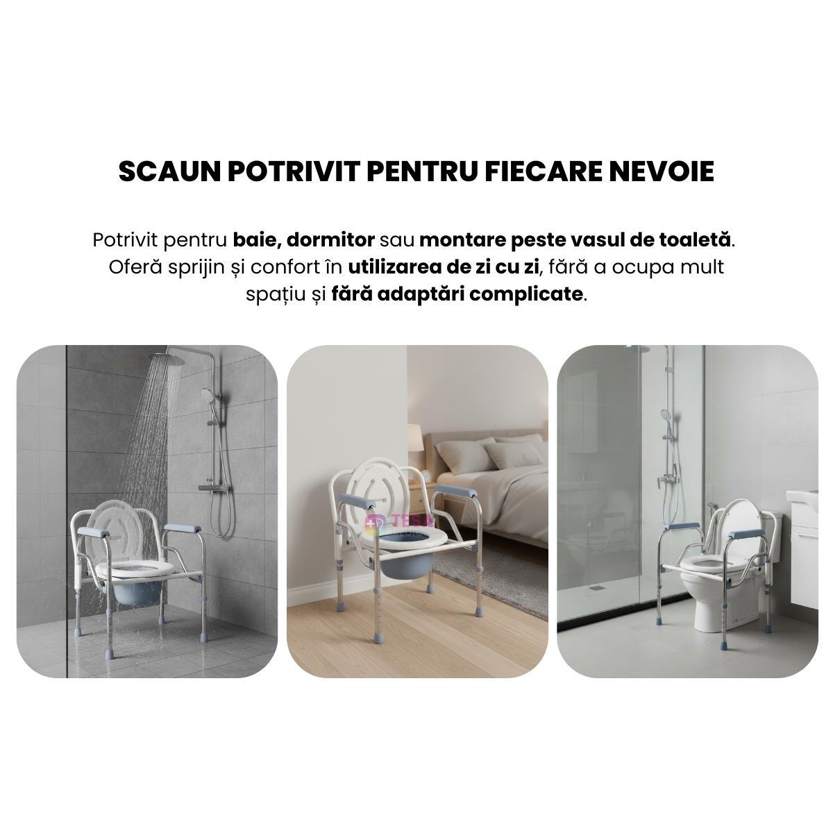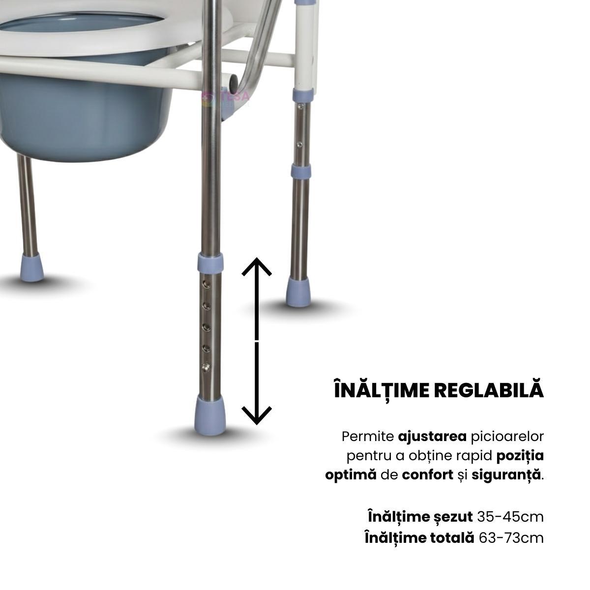 Scaunul este stabil, ușor de folosit și poate fi utilizat atât acasă, cât și în centre de îngrijire. Are cadru pliabil, se poate regla pe înălțime și este prevăzut cu un vas cu capac, care se curăță ușor.