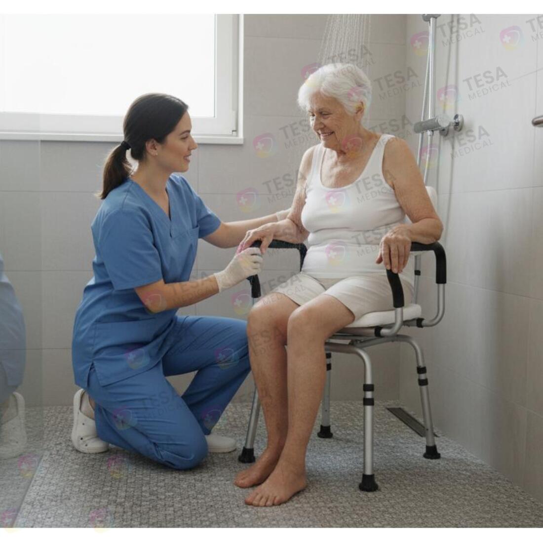 Scaun pentru dus, reglabil pe inaltime, rotativ 360°, pentru varstnici si persoane cu dezabilitati. Sezutul este realizat din LDPE(Polietilena de joasa densitate) de culoare alb.