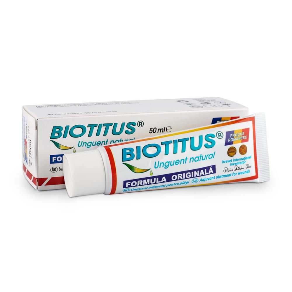 INDICATII: Produsul Unguent BIOTITUS® este recomandat pentru a îngriji și menține în bună stare pielea după răni (leziuni superficiale, arsuri, degerături, acnee, afecțiuni si plăgi cronice ale pielii), în timpul procesului de vindecare, pielea slăbită sau predispusă la răni, sau pentru uzul zilnic de îngrijire a pielii, îmbunătățindu-i aspectul. Prezența compușilor naturali activi stimulează efectul benefic și în același timp facilitează îngrijirea pielii foarte uscate și /sau descuamata, a cicatricilor post-acnee, cicatricilor cheloide, iritațiilor. Asigurând protecția pielii împotriva deshidratării, frecării și abraziunii, se comportă ca o peliculă de acoperire, protejând împotriva agresiunii factorilor externi care se pot constitui ca factori agravanți.