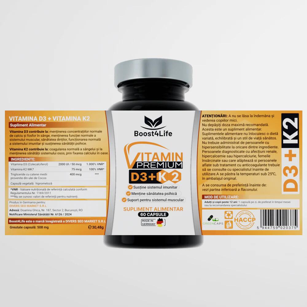 Combinația de vitamina D3 și vitamina K2 este una dintre cele mai eficiente formule pentru susținerea sănătății osoase, a imunității și a stării generale de bine. Datorită tehnologiei GreenCaps, produsul de la Boost4Life oferă o absorbtie superioară prin utilizarea uleiurilor organice în capsulă, cu beneficii reale pentru organism.