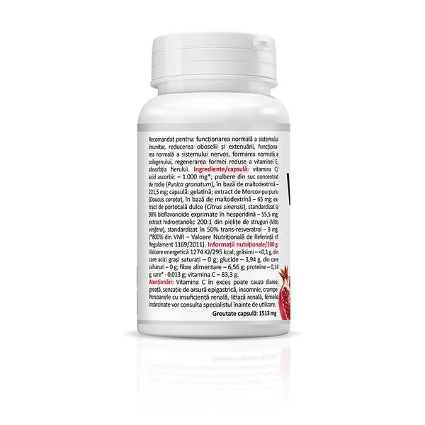 Conține 1000 mg de vitamina C/capsulă, susținută de extracte din citrice, rodie și resveratrol.